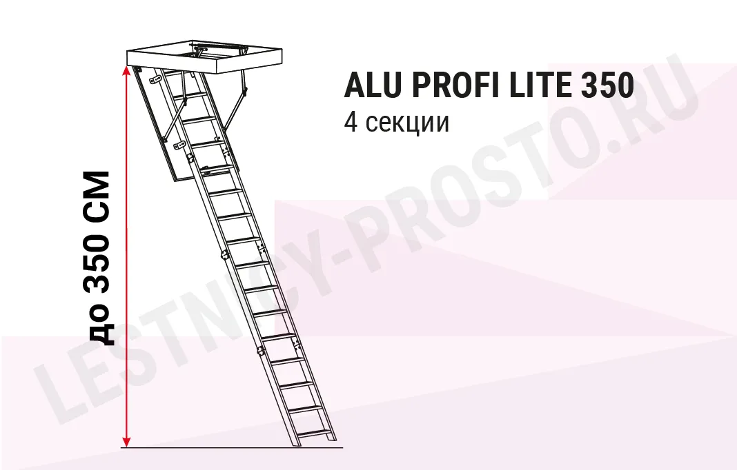Складная 3-х секционная чердачная лестница. Рабочая поверхность полностью выполнена из алюминия. Термоизоляционная крышка типа "сэндвич" имеет усиленную теплозащиту, облицована с двух сторон ДВП белого цвета. По контуру короба имеется уплотнитель; Все металлические элементы лестницы покрыты порошковой краской.