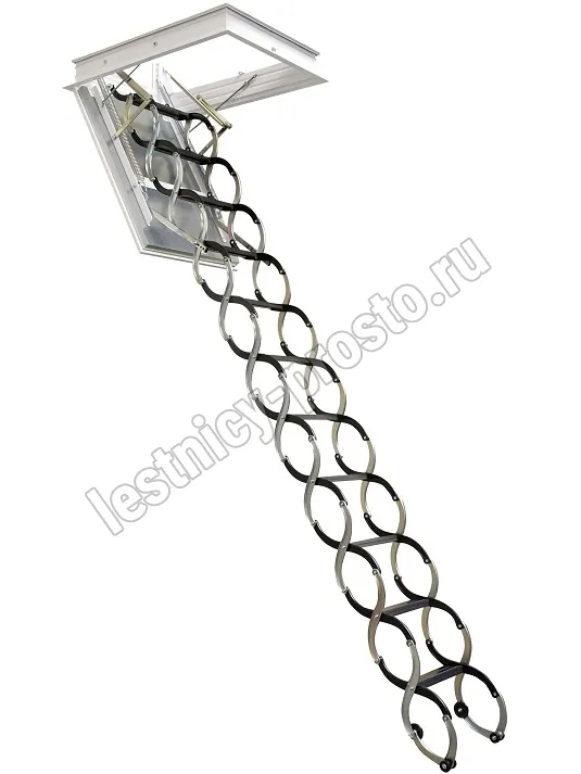 Крышка лестницы представляет собой многослойную конструкцию - деревянная рама, внутри которой находится пенопласт. Внутренняя часть крышки покрыта оцинкованной жестью, наружная часть белой эмалью и защитной пленкой. Толщина крышки 60 мм. Все соединяющие части изготовлены из твердого материала и имеют оцинкованное покрытие. Короб металлический высотой 140 мм., по периметру проходит уплотнитель. Ступени лестницы изготовлены из анодированной стали и покрыты порошковой краской, поверхность имеет антискользящие насечки и выдерживают нагрузку 150 кг.