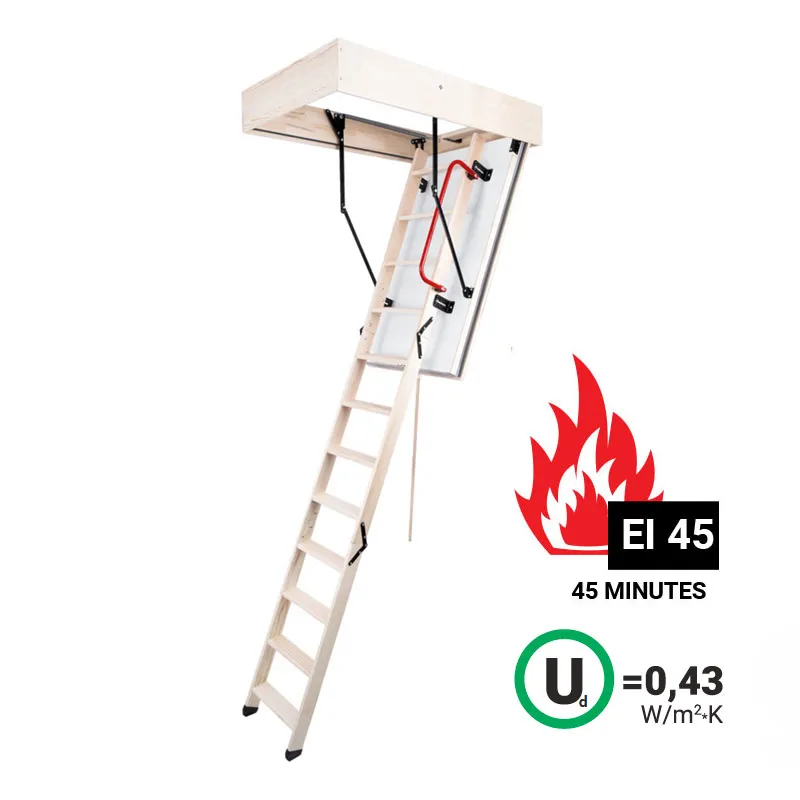 Чердачные лестницы EI45 POLAR имеют класс огнестойкости - EI45 (соответствует огнезащите в течении 45 минут),  они деально подходят для установки в помещениях подверженных возгоранию, их противопожарные свойства позволят эффективно изолировать помещение, в котором возник пожар, от чердака, тем самым предотвращая дальнейшее распространение огня.