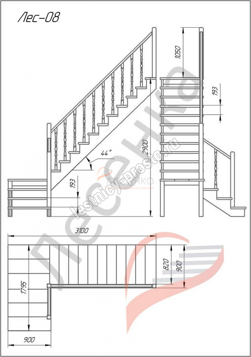 Деревянная межэтажная лестница ЛЕС-08, Бук с подступенкой