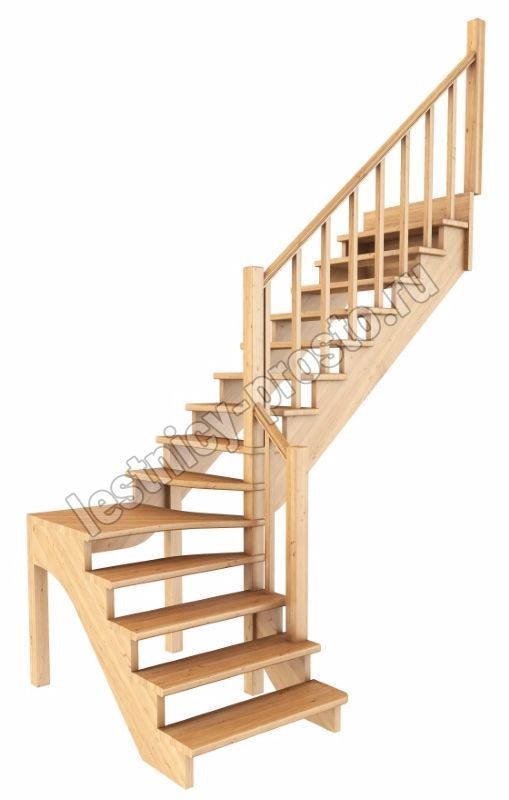 Ступени и поручень лестинцы изготовлены из бука, остальные элементы из сосны. Возможно изготовление данной модели полностью из бука. Базовый комплект включает в себя деревянные элементы лестницы и ограждения без какого-либо покрытия.