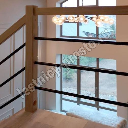 В комплекте: 3 прямых деревянных столба без какого-либо покрытия и профильный поручень без покрытия, комплект из 3 ригелей из стали (окрашены в цвет каркаса или хром по желанию) диаметром 12 мм., необходимая фурнитура.