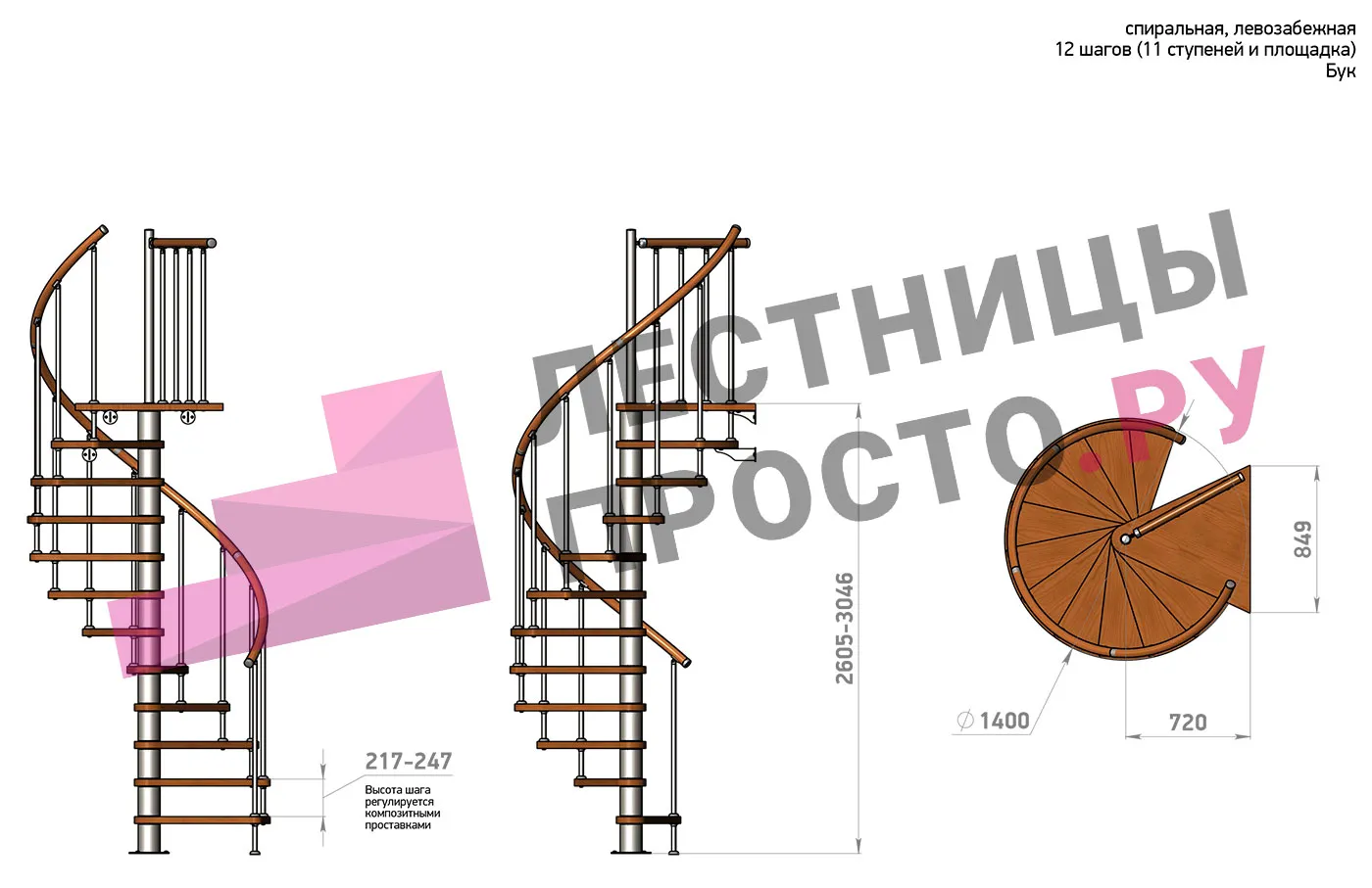Правая, d=140см, 11 ступеней + площадка